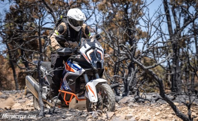 The electronics, particularly in the optional Rally mode which allows for adjustable throttle response as well as on-the-fly adjustment of TC with its new ergonomically placed +/- paddles, lets you really tailor the ride to the terrain. I’ve said it before with the middleweights, but KTM has really hit the nail on the head with the way its electronics package integrates with the motorcycle and rider. Rather than feeling gimmicky, the systems are easy to use and allow you to help push the envelope.