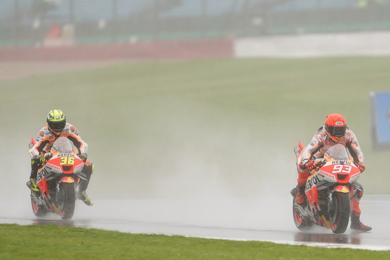 Overnight rain continued through Saturday for a mostly wet day at the British GP. With conditions constantly changing as the rain eased and returned heavier, picking the correct moments to push for fast laps was crucial. The morning session saw both Repsol Honda Team riders spend the majority of their time on track, working to learn and understand the 5.9-kilometer-long circuit in the wet.